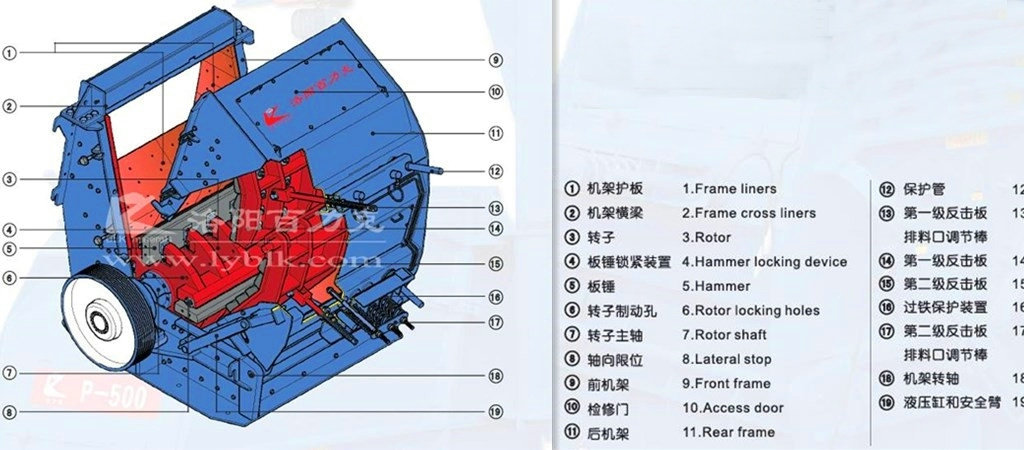 反擊式破碎機工作時,在電動機的帶動下,轉子高速旋轉,物料進入板錘作用區時,與轉子上的板錘撞擊破碎,后又被拋向反擊裝置上再次破碎,然后又從反擊襯板上彈回到板錘作用區重新破碎,此過程重復進行,物料由大到小進入一、二、三、反擊腔重復進行破碎,直到物料被破碎至所需粒度,由出料口排出。調整反擊架與轉子之間的間隙可達到改變物料出料粒度和物料形狀的目的。